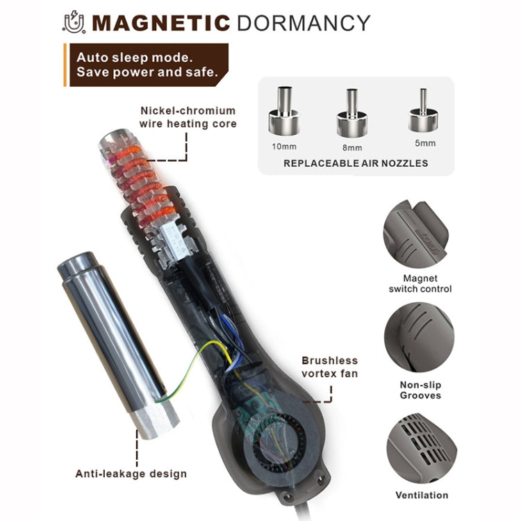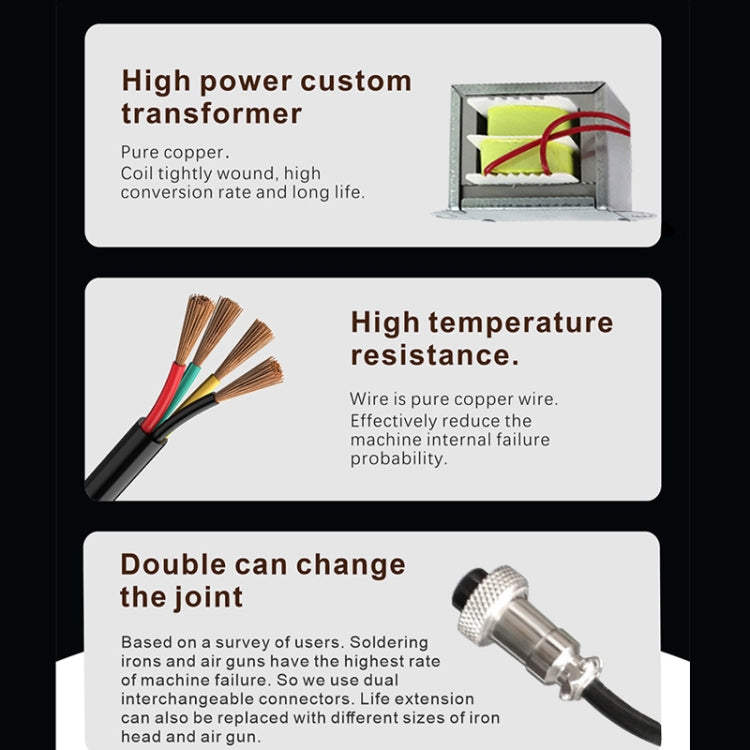7. Equipped with replaceable resistors, overvoltage protection automatically power off to prevent safety accidents. The soldering iron and air gun handles are automatically protected from overheating to prevent damage to machines and people.
